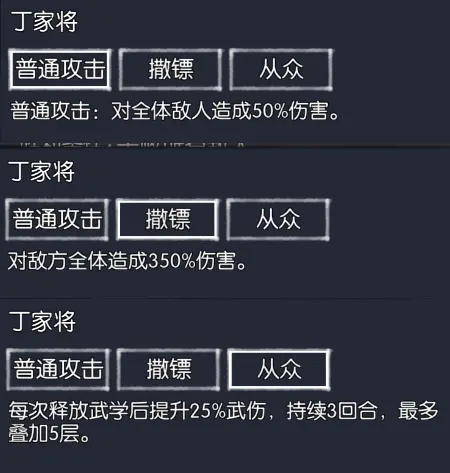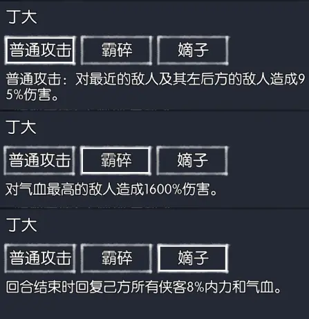 第三套阵容是换上笛羽的阵容,笛羽的技能在本关很有发挥,嗜血,小子!说直白点就是个加强力buff的,保证在其他侠客都下场后带八宝棍的主角能站得住,撑着和丁家将互殴几波,险胜也是胜。