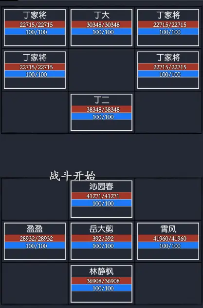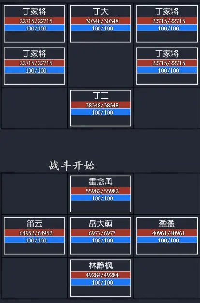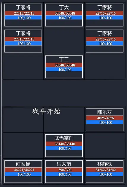 第一套阵容是最标准思路:主角带八宝棍在最前排,开局献祭大剪和楚楚,霄浩然降对面透劲,顺便给对面几拳。在兄弟姐妹的加持下,数值上小林子甩三万九的缺剑术能刚好杀掉丁二,丁大也一起解决了,第一回合完美带走两个最难缠的家伙。